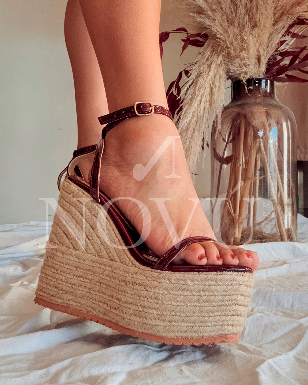 ✔ Aplicaciones o características adicionales: Tiras delgadísimas para un diseño limpio y elegante; contraste entre el brillo del charol y el acabado mate del yute